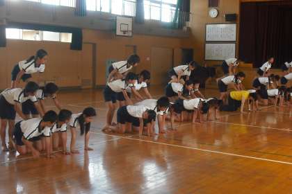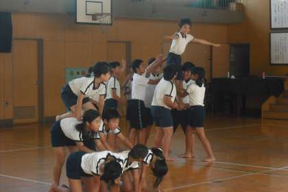 午後からの厳しい暑さの中、組体操の練習に取り組んでいる5・6年生です。職員室にいると講堂から「せーの!」「せーの!」と気合いの入った声が聞こえてきます。