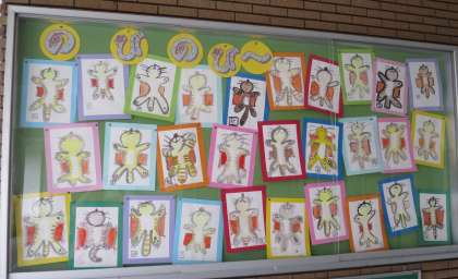 今月の玄関掲示板には、6年生の作品が掲示されています。ねこが、ざぶとんの上で伸びている様子が描かれています。可愛くて癒される作品です!ご来校の際にはぜひご覧ください。