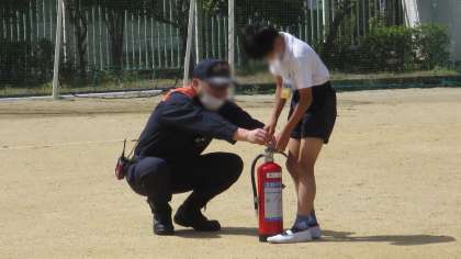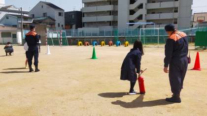 避難訓練の後は消防士さんに教えていただきながらの消火訓練
