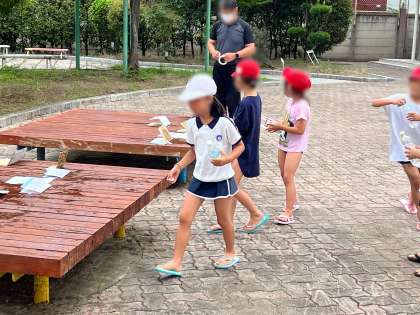 1.ペットボトルやケチャップなどの容器を水鉄砲にして、みんなで作った的をめがけて水をかけました。