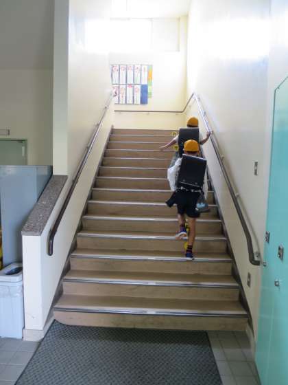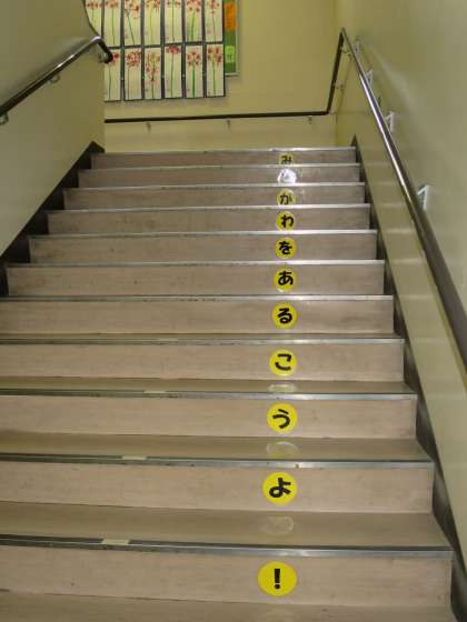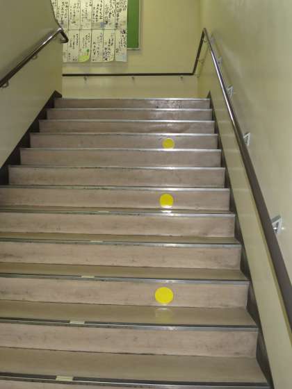 廊下や階段は右側通行で歩くことを徹底するために、階段に掲示を始めました。低学年には言葉で、高学年には黄色の印で呼びかけています。子どもたちも意識して歩くようになってきました。