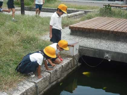 中庭には、今まで2匹のコイや、モツゴ、ザリガニなどがいました。近所の方のご厚意で、大小立派なきれいなコイをいただきました。大切に育てたいです。