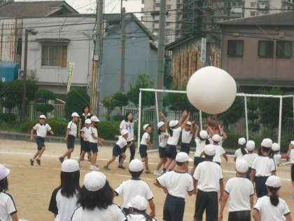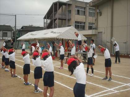 くもり空の下、涼しさを感じながら全体練習をしました。今日は、閉会式と全校児童による大玉送りを行いました。