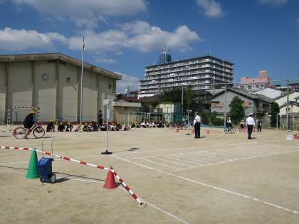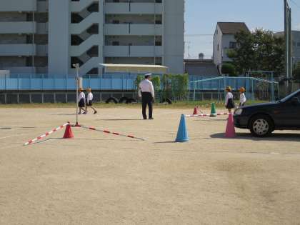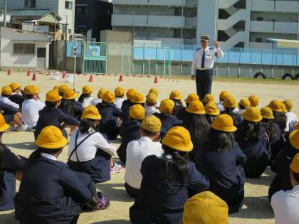 生野警察暑のおまわりさんに来ていただき、道路の歩き方や自転車の乗りかたなどについて、交通安全指導をしていただきました。「信号を守る」「飛び出さない」当たり前のことですが、しっかり守って事故に遭わないようにしましょう。