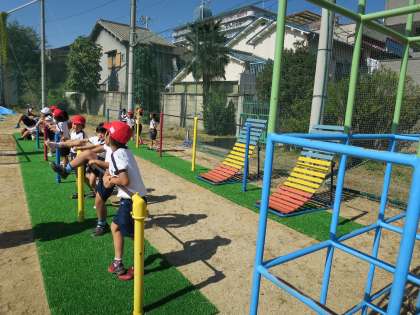 本校では、毎学期50メートル走の記録をとります。タイムの向上を目標に、楽しく意欲的に取り組めるような体力づくりを行っています。また、児童が安全に鉄棒に取り組めるように、鉄棒の下に人口芝生を敷きました。体育の時間には、1年生が芝生の上でいろいろな技に挑戦していました。