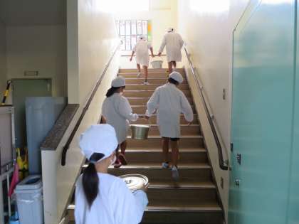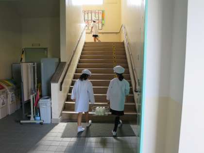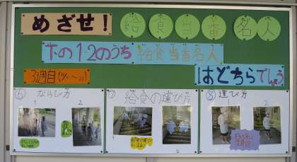 今週の給食当番名人クイズは、給食当番の並び方、給食の運び方についてでした。正しく持てば、落としたりこぼしたりすくことなく、きちんと運べます!