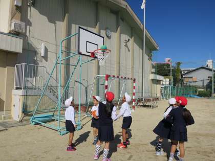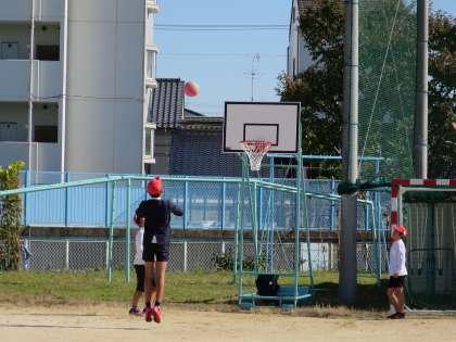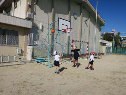 運動場に、バスケットゴールが2つ設置されました。休み時間には、シュートをして楽しんでいます。運動を楽しみながら体力向上にもつながってほしいです。