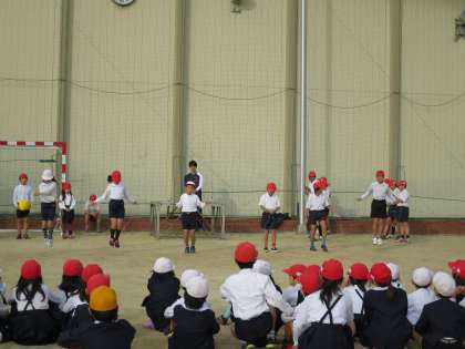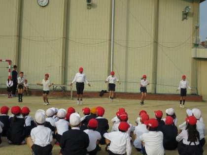 今朝の児童集会では、各学年のなわとび名人の技の発表がありました。体育の時間や休み時間、家でなどたくさん練習してきた成果ですね。見ている子どもたちから、温かい拍手がおくられました。