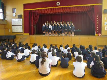 今朝の児童朝会で、6年生が平和学習で学んだことを発表を「よびかけ」と「歌」で発表しました。さすが6年生、平和への気持ちが強く伝わってくるすばらしい発表でした。