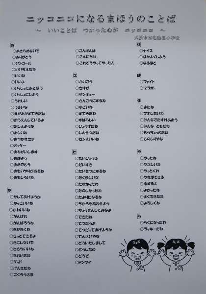 全児童で考えた「つかった心がニッコニコになるいいことば」を一つに集めて、掲示しています。みんながニコニコになる素敵なことばばかりです!