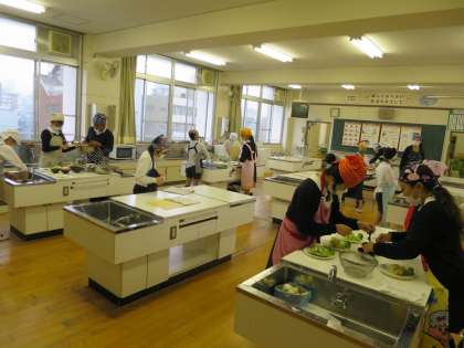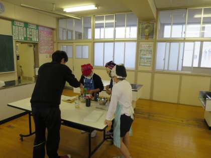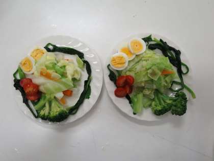 調理実習で、ゆで野菜のサラダを作りました。班に分かれて野菜を切ったりゆでたり、後片付けをしたりと、手際よく調理していました。ドレッシングも手作りです!盛り付けも工夫しておいしいサラダが完成しました。