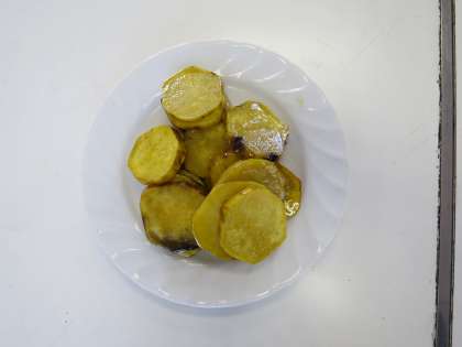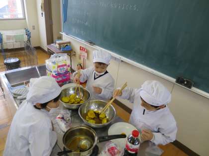 学習園で育てたさつまいもを使って、大学いもを作りました。電子レンジでやわらかくしてから、フライパンで焼いて、たれをからめて盛りつけます。はりきって楽しそうに調理していました。おいしくできて嬉しいね(*^_^*)