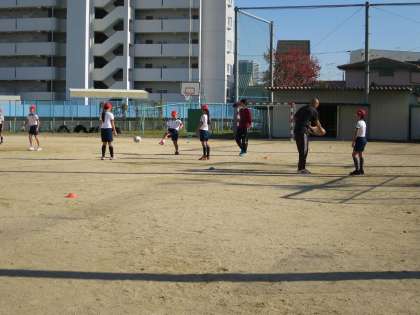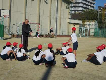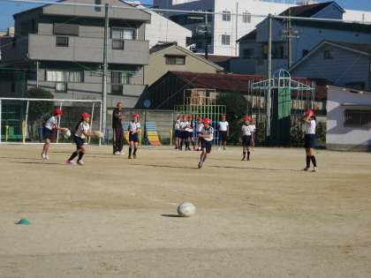 鶴橋中学校の体育科の先生にお越しいただき、ラグビーを教えていただきました。ボールの投げ方やけり方、パスの仕方など、グループになって練習しました。初めてのラグビーでしたが、みんなで楽しむことができました。ありがとうございました。