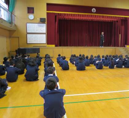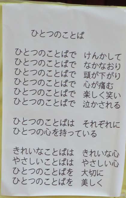 今朝の児童朝会では校長先生から北原白秋さんの詩「ひとつのことば」の紹介がありました。詩の中にも表現されている通り、ことばは、人の気持ちを表します。自分たちの言葉遣いについて、一人一人が気を付けたいものです。