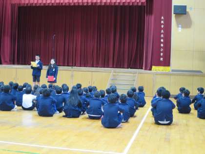今朝の児童朝会では、全校で行う朝のあいさつが、とても元気がよくて校長先生からほめていただきました。いつでも今日のような気持ちのよい元気なあいさつを心がけたいものです。また、児童会からは、赤い羽根共同募金の報告がありました。たくさんのご協力ありがとうございました。