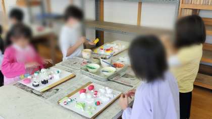 白い紙粘土で作ったものに絵の具を使って色づけ