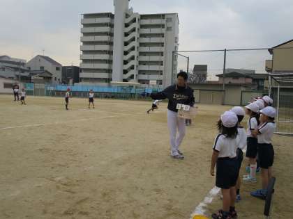 オリックスバッファローズからゲストティーチャーをお迎えし、Tボールを学習しました。ボールを打ったり、投げたり、チームで声をかけあって楽しく体を動かしました。