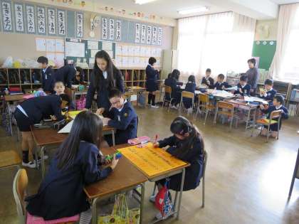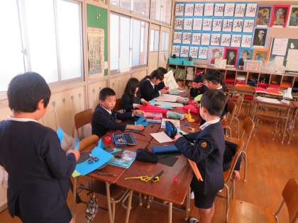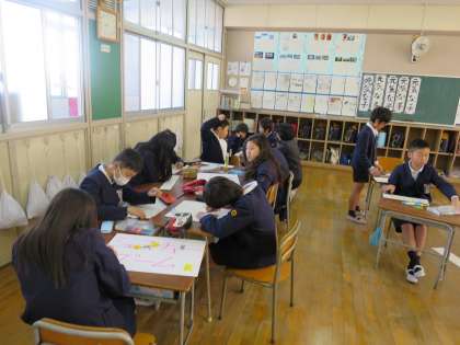 北鶴フェスティバルに向けて、たてわり班に分かれて製作活動をしました。お店のポスターや看板を作ったり、ゲームに必要なものを作ったりしました。学年を超えて班のみんなで協力してがんばっています!