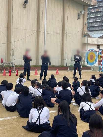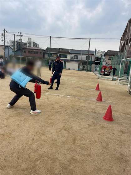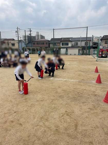 消防署の方に来ていただき、消火器の使い方も教わりました。子どもたちが消火器体験をしたあとは、先生もしっかり練習しました。