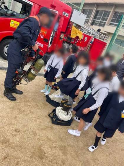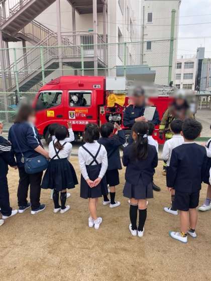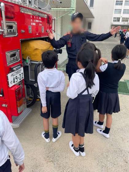 3年生は社会科で消防署について学習します。消防士さんへの質問をした後、特別に消防車の中に乗ったり、設備を見せてもらったりしました。