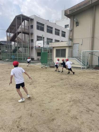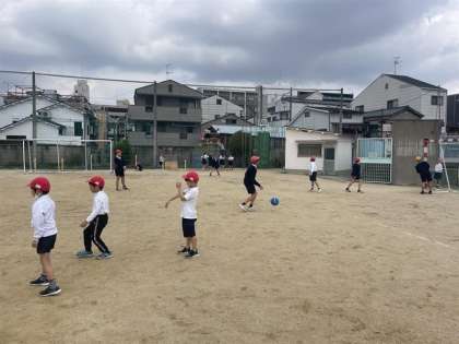 春休みが終わり、久しぶりに学校の友だちと広い運動場で遊ぶ子どもたち。バスケットボールやドッジボール、中には一年生に優しく声をかけてくれるお兄さん、お姉さんの姿も。この後急に雨が降り出しました。20分休みはしっかり遊べてよかったですね。