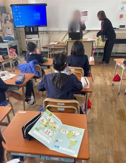 新しいC-NETの先生を迎えての外国語の授業。4年生では国旗を見ながらさまざまな国の呼び方を学習しました。日本の呼び方とは違う国もあるので、発音をよく聞いてひとつずつ確認していきました。