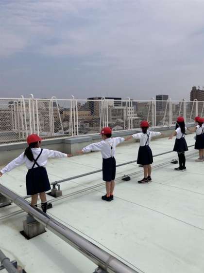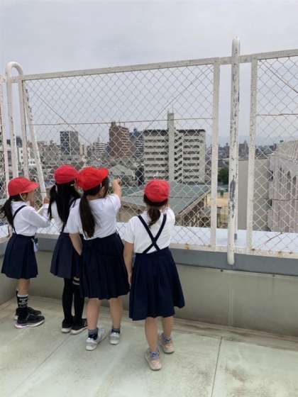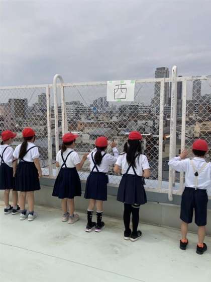 3年生は自分たちの住むまちについて学習します。屋上に行き、東西南北の方角を確認しながらまちの様子を見てまわりました。