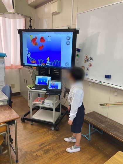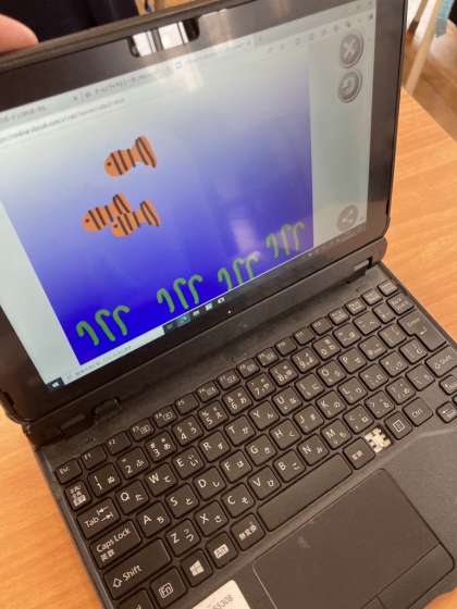 プログラミングの教材のビスケットを体験しました。オリジナルのキャラクターをデザインして、どのように動かすのか考えながらプログラミング。できたプログラムを発表し合いました。