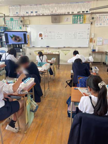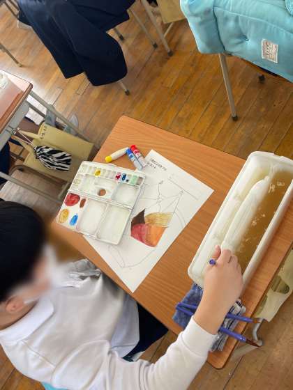 6年生は三原色を使って、たけのこの色を塗っていました。