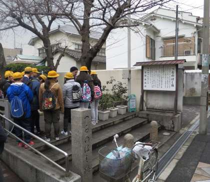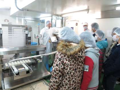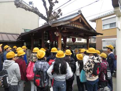 地域のフィールドワークを行いました。校区内にある史跡をめぐって説明を聞いていると、いつも何気なく通っている場所に、実はこんな歴史が・・・ということをたくさん発見できました。また、地域にあるお餅の工場を見学させていただきました。