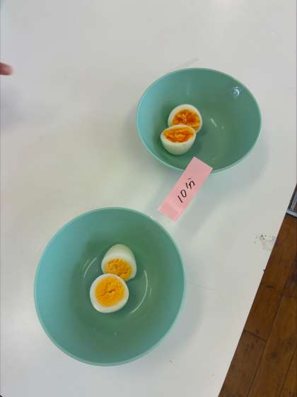 調理時間によって黄身の固まり方が違うことを知り、自分の好みのかたさに仕上げるにはどれくらいゆでればよいのかを考えていました。