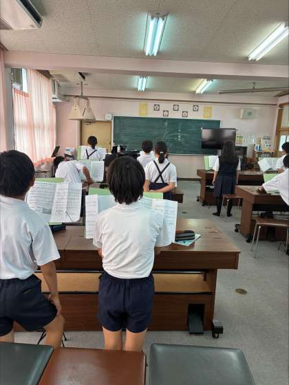5年生はハ長調の和音で構成されている「こきょうの人々」について、和音や低音のはたらきを感じ取りながら合唱をしていました。