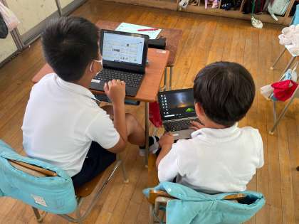 フィールドワークに行き、学習したことをまとめています。ペアになって、写真やクイズも加えながらパワポ資料を作成しました。