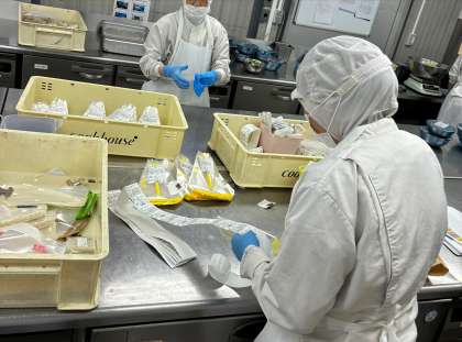 エプロンに着替えて、手指の消毒、ローラーでほこりを取ってから入室。食品を扱う工場では、衛生面にとても気をつけています。