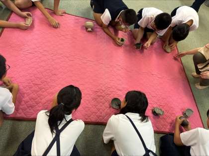 前半は弥生時代の人々の生活がわかる土器(本物だそう)や石包丁、斧などを実際に見て、触って学びました。