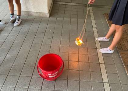後半は火おこし体験。木の棒と縄で火種を作り、麻の袋の中に火種を入れてゆっくり振るとたちまち炎が!