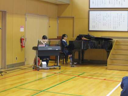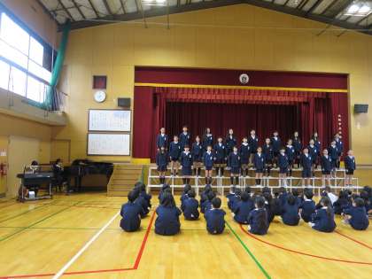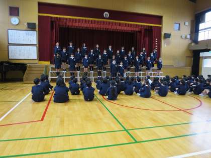 今朝の児童朝会で、6年生が卒業式で歌う歌「ベストフレンド」の発表をしました。卒業式に参加する5年生はもちろん、参加しない1年生から4年生にも聞いてほしいという願いがこめられています。みんなの気持ちが一つになった素敵な歌の発表でした。