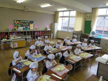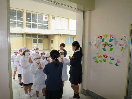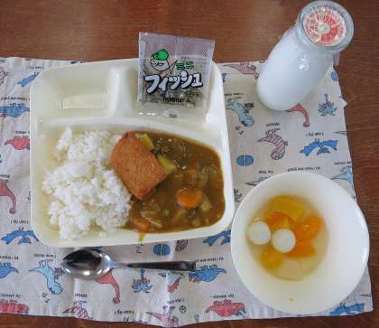 今日の給食は入学祝い献立でした。カツカレーライスには、うさぎやくま、ぞうやぶたの型をくりぬいたラッキーにんじんも入っていました!嬉しいですね(*^_^*)ごちそうさまでした。