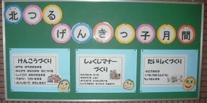 11月は北鶴元気っ子月間です。合言葉は「北鶴 元気 元気 オー!」です。健康づくり、食事マナーづくり、体力づくりをがんばります。。