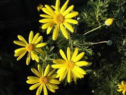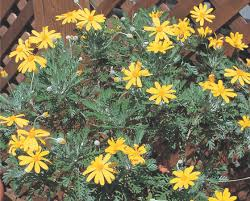 中庭の講堂前に2株あります。秋から春にかけて、黄色の花を長期間咲かせます。葉や茎に細毛が生えているので、全体が灰白色に見えます。原産地は南アフリカで、株は大きくなると茎が木質化してさらに大きくなります。