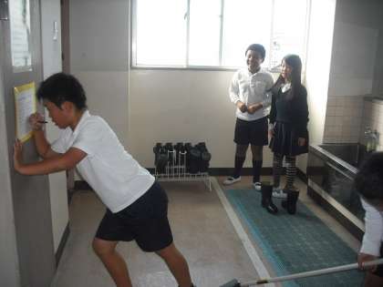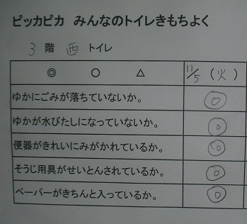 11月は、健康委員会の児童がトイレそうじの点検をします。そうじが終わるころに担当の児童が点検に来て、チェック表に○△×を記入します。この日は◎をもらい、そうじした児童もとてもうれしそうでした。