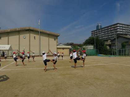 円陣を組んで、みんなで気合を入れて練習を始めました。運動場での感覚をつかみながら、一生懸命がんばっています。