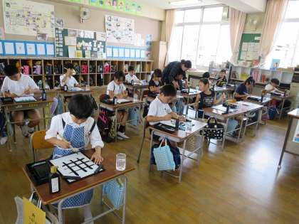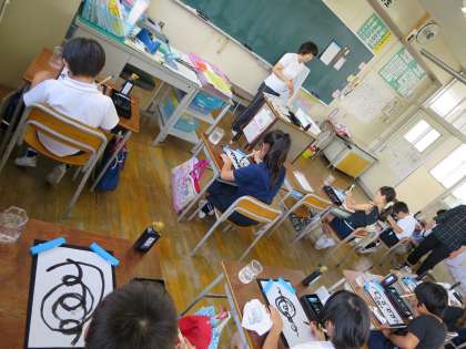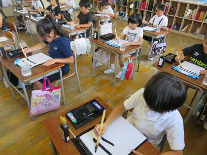 習字の学習で、初めて墨汁を使って書きました。ちょっとおそるおそる、でも筆を使うことが楽しそうです。今日は、たて線、横線そして○の練習をしました。