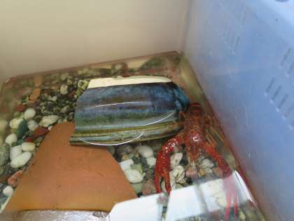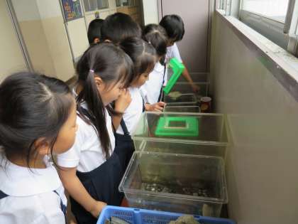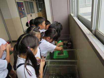 休み時間に、2年生がザリガニの水槽のところに集まっていました。エサをやったり、観察したり、呼びかけたり!みんなで大切に育てています。