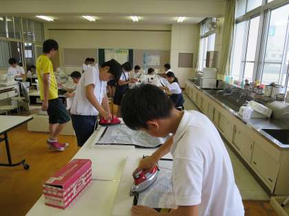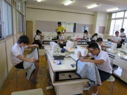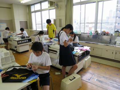 ミシンでエプロンを縫っています。縫う前には、アイロンやしつけもしています。慣れないミシンですが、みんな一生懸命です。完成まであと少しです!!がんばってね。