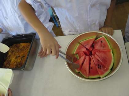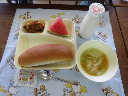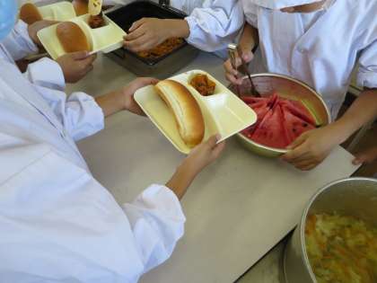 今日の給食は、すいかがでました。北鶴橋小学校では、すいかを2玉使っています。1つのすいかから、64人分がとれます!暑い季節です。すいかのような果物からもしっかりと水分をとるのもよいですね。