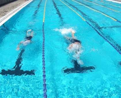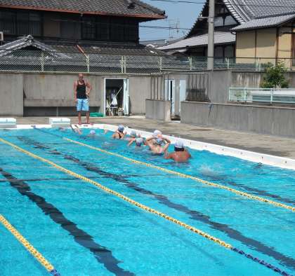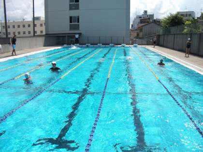 鶴橋中学校のプールを体験させていただきました。中学校の先生に、全体でも個々でも泳法やそのコツを教えていただきました。小学校のプールに比べて水深が30センチメートルほど深かったです!