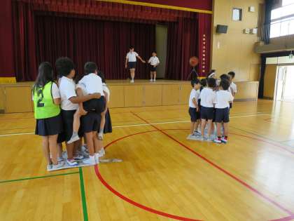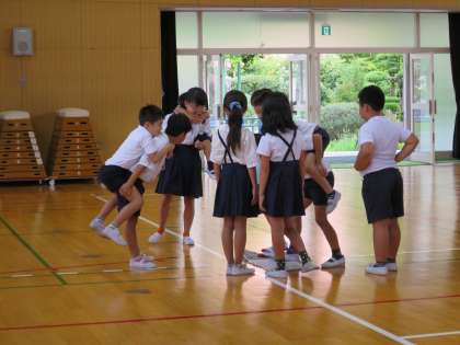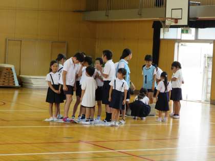 今朝の児童集会は、たてわり班対抗で「新聞のりゲーム」をしました。じゃんけんで負けると、新聞をたたむので新聞に乗りきれなくなってしまます。乗り方を班で工夫しながら楽しみました。