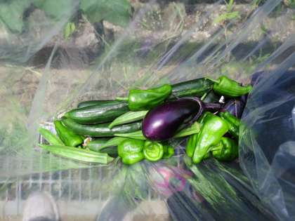 学習園の野菜がたくさんできています。大きくてみずみずしくて立派です!2年生が4時間目に収穫をしました。はさみを持って順番に収穫したり、葉っぱをさわって感触を楽しんだり、花の色を観察したりしました。