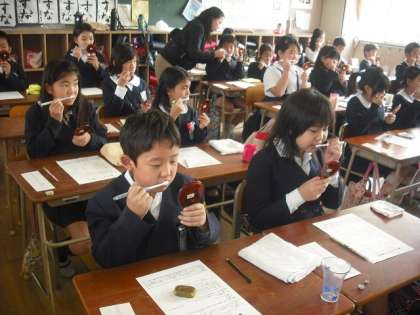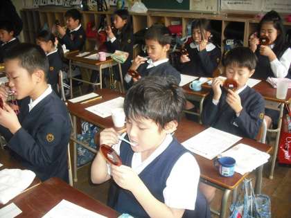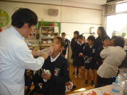 4年生は、フッ化物塗布を行いました。歯垢を残さないように、みんなで順を追って歯みがきをしました。縦みがき、横みがきなど、鏡を見ながら丁寧にみがきます。その後、保健室でフッ化物を塗布しました。